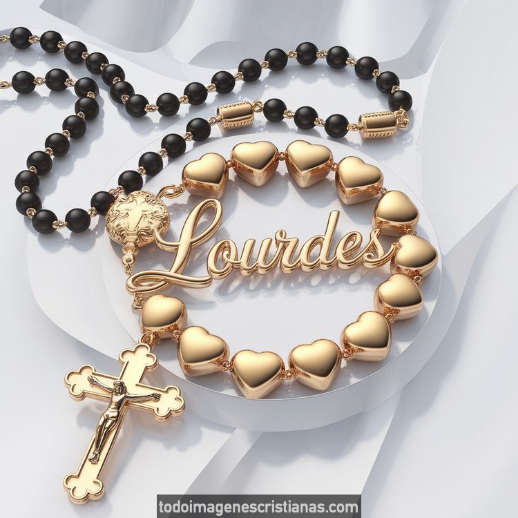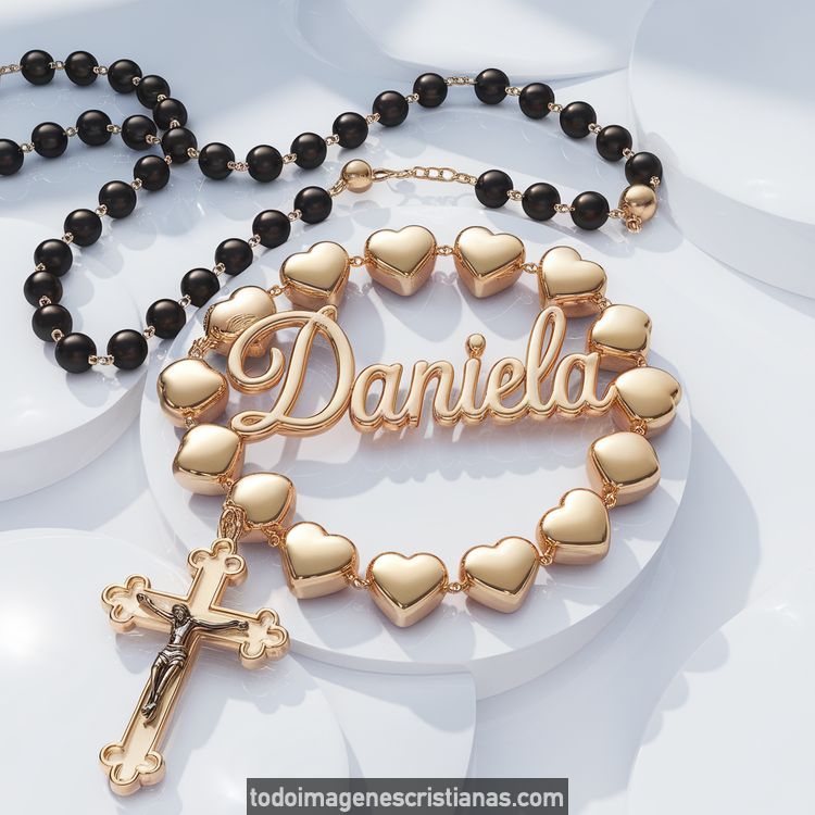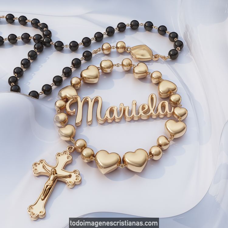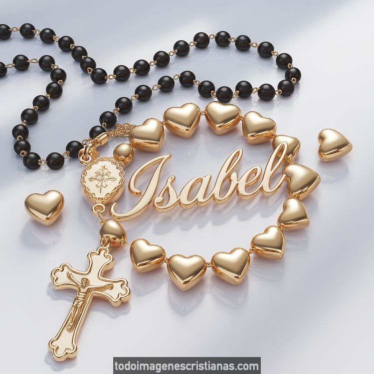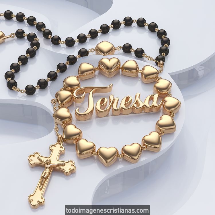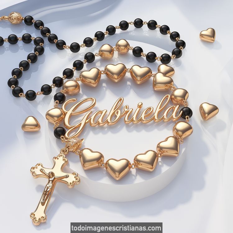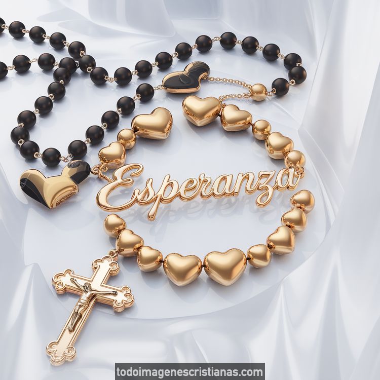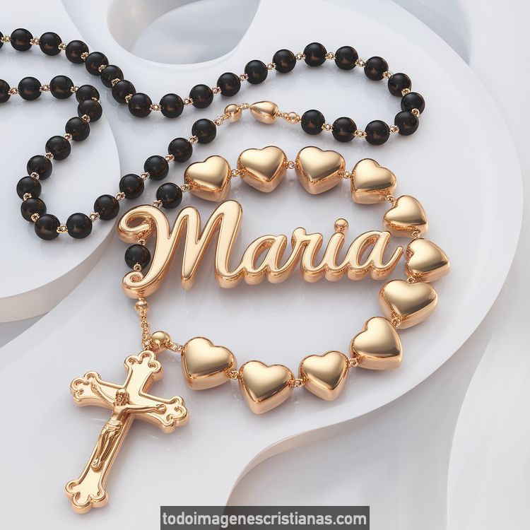 Para más detalles, el diseño consta de un rosario en color negro y dorado, y debajo está el nombre en 3d en color dorado con cuentas y corazones. Esto le da un aspecto muy elegante que seguramente les va a gustar. Los invitamos a que miren la lista de fotos y descarguen su nombre gratis.