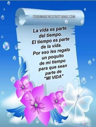 Sumamos más imágenes cristianas con frases al sitio para que descarguen y las usen como más les guste. Como pueden ver, la imagen tiene un diseño en fondo azul con un papiro y flores de color violeta. Además también tiene una frase que dice lo siguiente: "La vida es parte del tiempo. El tiempo es parte de la vida. Por eso les regalo un poquito de mi tiempo para que sean parte de MI VIDA".
