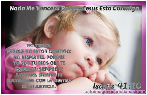 Les dejamos esta hermosa imagen cristiana con frase para que puedan usar en sus muros o donde más les guste. En la imagen podemos ver una niña dulce y la frase: "Nada me cenverá porque Jesús está conmigo". También podemos ver un salmo de Isaías 41:10 que dice "No temas, porque estoy contigo; no desmayes, porque yo soy tu Dios que te esfuerzo; siempre te ayudaré, siempre te sostendré con la diestra de mi justicia".