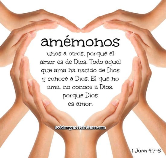 "Amémonos unos a otros, porque el amor es de Dios. Todo aquel que ama ha nacido de Dios y conoce a Dios. El que no ama, no conoce a Dios, porque Dios es amor".