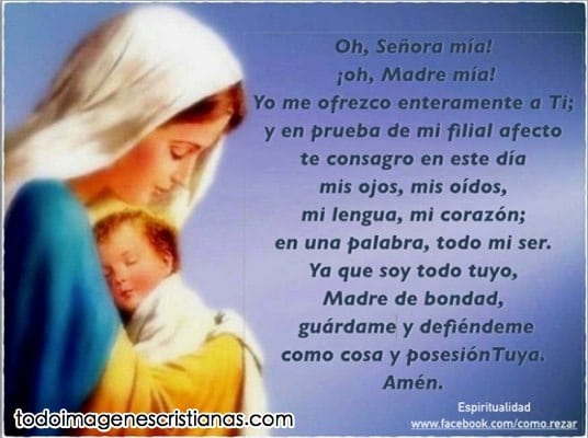 Oh, Señora mía! ¡Oh, Madre mía! Yo me ofrezco enteramente a Ti; y en prueba de mi filial afecto te consagro en este día mis ojos, mis oídos, mi lengua, mi corazón; en una palabra, todo mi ser. Ya que soy todo tuyo, Madre de bondad, guárdame y defiéndeme como cosa y posesión Tuya. Amén.