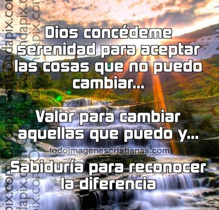 Nueva imagen o notita con una oración hacia Dios, se llama la oración de la Serenidad y debemos orarla o rezarla cuando estamos nerviosos, inquietos y mal por alguna situación... invoquemos a Dios y pídamosle serenidad a través de esta bellísima oración que dice asi: "Dios concédeme serenidad para aceptar las cosas que no puedo cambiar... Valor para cambiar aquellas que puedo y...Sabiduría para reconocer la diferencia". Si quieres compartir la oración con tus amigos descarga la imagen y súbela en Fb.