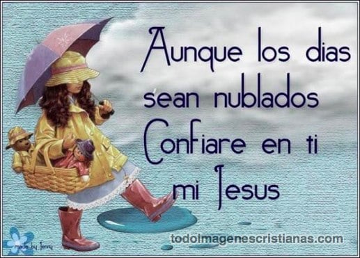 Siempre debemos ponernos en las manos de Cristo, en todo momento, tanto de felicidad como de tristeza. Solo El podrá ayudarnos, solo El sabe como hacerlo. Para que lo recuerdes siempre te dejamos la siguiente imagen cristiana que contiene la frase: "Aunque los días sean nublados confiaré en ti Mi Jesús", además de adorno contiene una muñequita caminando bajo la lluvia y algo triste y pensativa. Descarga y comparte en tu muro de Facebook, bendiciones.