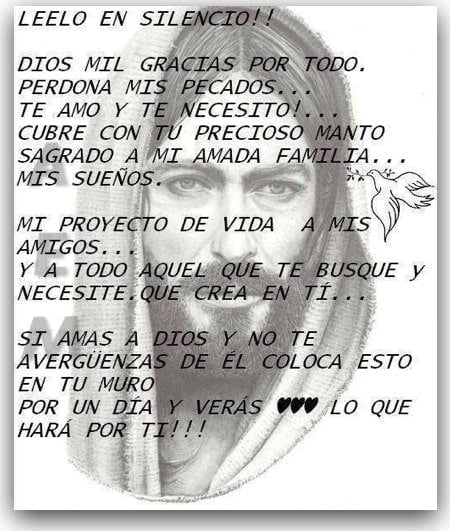 Dios mil gracias por todo. Perdona mis pecados, te amo y te necesito! Cubre con tu precioso manto sagrado a mi amada familia... mis sueños. Mi proyecto de vida, a mis amigos... y a todo aquel que te busque y necesite, que crea en ti. Si amas a Dios y no te avergüenzas de Él. Coloca esto en tu muro por un día y verás lo que hará por ti.