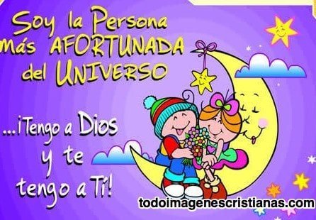 "Soy la persona más afortunada del universo, tengo a Dios y te tengo a tí!" dice esta bella imagen de amor cristiana, la cual puedes regalar u obsequiar a tu esposo o esposa. En la misma podemos ver una linda, dulce y tierna pareja de enamorados sentados en una media luna sonriente y alegre.