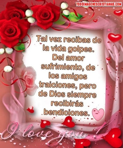 "Tal vez recibas de la vida golpes. Del amor sufrimiento, de los amigos traiciones, pero de Dios siempre recibirás bendiciones". Eso es lo que dice la hermosa imagen que les queremos dejar a continuación. Como pueden ver, tiene un diseño muy lindo con un marco hecho de flores y corazones, lo cual le da un efecto muy lindo. Esperamos que les haya gustado y que la descarguen para compartirla con quien quieran.