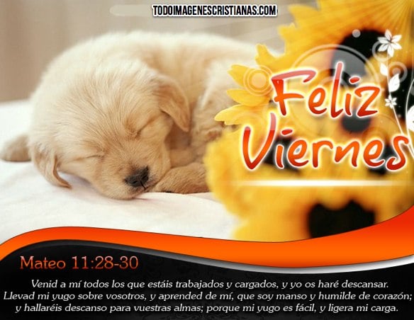 Hoy ya es viernes otra vez y queremos dejarles esta hermosa imagen para saludar a sus amigos y desearles un buen viernes. Como pueden ver, en la imagen hay un simpático perrito durmiendo, un deseo de feliz viernes, y una frase que dice: Venid a mí todos los que estáis trabajados y cargados, y yo os haré descansar. Llevad mi yugo sobre vosotros, y aprended de mí, que soy manso y humilde de corazón; y hallaréis descanso para vuestras almas; porque mi yugo es fácil, y ligera mi carga.