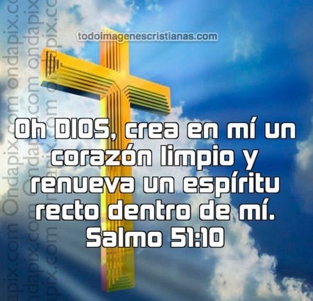 Les dejamos una imagen crisiana del salmo 51:10 que dice "Oh Dios, crea en mí un corazón limpio y renueva un espíritu recto dentro de mí", a través de este Salmo le pedimos a Dios que no retire su santísimo espíritu de nosotros. Si les gusta la imagen y desean compartirla o regalarla, lo pueden hacer a través de Facebook. Bendiciones!.