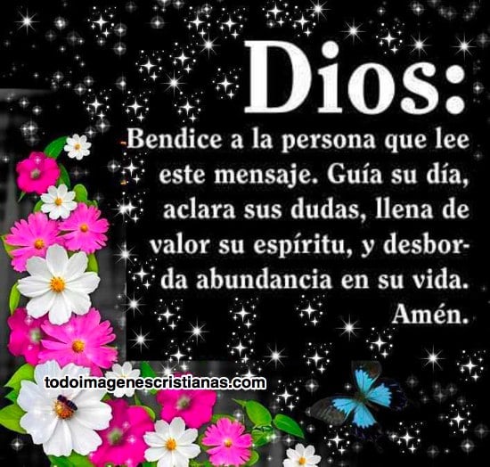 Nos encanta dejarles lindas imágenes con frases cristianas para reflexionar y pedir bendiciones para la vida de las personas que queremos. En esta oportunidad la imagen tiene una frase donde se pide por la bendición de nuestros amigos que leerán o verán la imagen, dice "Dios: Bendice a la persona que lee este mensaje. Guía su día, aclara sus dudas, llena de valor su espíritu y desborda de abundancia en su vida. Amén". Para que esta bendición llegue a su vida, descarga y comparte la imagen en Facebook, de manera que todos tus amigos la vean y llegue a sus vidas la bendición de Dios.