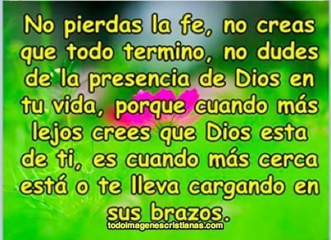 "No pierdas la fe, no creas que todo terminó, no dudes de la presencia de Dios en tu vida, porque cuando más lejos crees que Dios está de ti, es cuando más cerca está o te lleva cargando en sus brazos" hermosa imagen cristiana que nos hace dar cuenta que Dios es fiel con sus hijos, siempre hay que mantener la fe y saber que El está ahí para ti, descarga la imagen y compartela en tu muro de Facebook. Bendiciones.