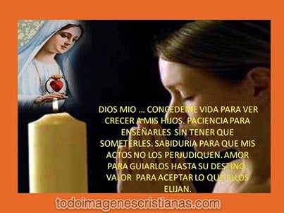 Hoy les queremos dejar esta hermosa imagen cristiana que en realidad es un pedido a Dios para poder criar bien a nuestros hijos. La imagen dice lo siguiente: Dios mío... concédeme vida para ver crecer a mis hijos, paciencia para enseñarles sin tener que someterles. Sabiduría para que mis actos no los perjudiquen. Amor para guiarlos hasta su destino. Valor para aceptar lo que ellos elijan.
