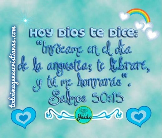 "Hoy Dios te dice: Invócame en el día de la angustia?; te libraré, y tú me honrarás" Salmo 50:15, hermosa frase que colocamos en una bella imagen cristiana toda adornada con corazones, arco iris y mucho color. Los invitamos a descargarla y colocarla en el muro de Face para compartir con nuestros seres queridos estas palabras sagradas, bendiciones para todos.