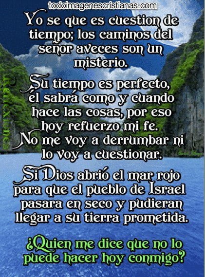 Yo sé que es cuestión de tiempo; los caminos del Señor a veces son un misterio. Su tiempo es perfecto, Él sabrá cómo y cuándo hace las cosas, por eso hoy refuerzo mi Fe. No me voy a derrumbar ni lo voy a cuestionar. Si Dios abrió el mar rojo para que el pueblo de Israel pasara en seco y pudieron llegar a su tierra prometida. ¿Quién me dice que no lo puede hacer hoy conmigo?