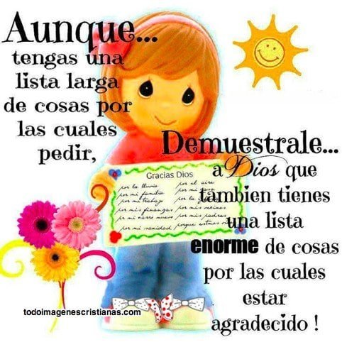 "Aunque tengas una larga lista de cosas por las cuales pedir, demuestra a Dios que también tienes una lista enorme de cosas por las cuales estar agradecido". No es de buen cristiano solo acordarse de Dios en los malos momentos, solo cuando debemos pedirle... debemos recordarlo siempre, y por sobre todas las cosas, agradecer! agradecer por cada minuto de vida, por cada cosa, por cada persona, por cada situación, aunque no sea ni la esperada ni la querida, es lo que debe ser de acuerdo al Plan Divino que El tiene para cada uno de sus hijos. Agradece desde el corazón y sonríe! Dios te ama.