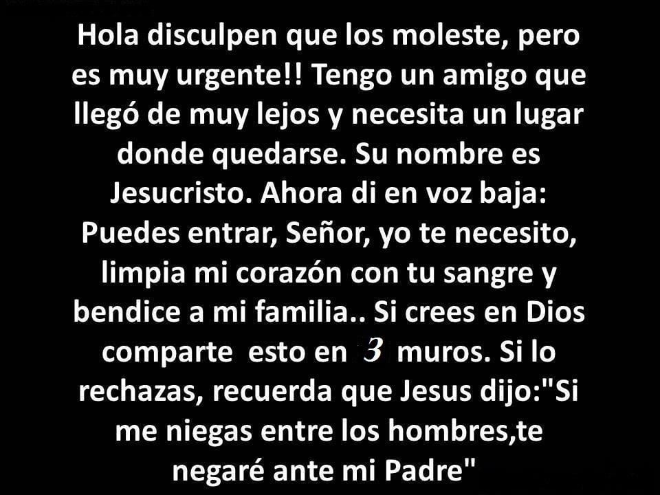 "hola disculpen que los moleste, pero es muy urgente! tengo un amigo que llegó de muy lejos y necesita un lugar donde quedarse. Su nombre es Jesucristo. Ahora si en voz baja: puedes entrar, Señor, yo te necesito, limpia mi corazón con tu sangre y bendice a mi familia. Si crees en Dos comparte esto en 3 muros. Si lo rechazas recuerda que Jesús dijo si me niegas entre los hombres, te negaré ante mi padre".