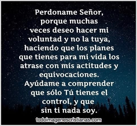 Perdóname Señor, porque muchas veces deseo hacer mi voluntad y no la tuya, haciendo que los planes que tienes para mi vida los atrase con mis actitudes y equivocaciones. Ayúdame a comprender que solo tú tienes el control, y que sin ti nada soy.