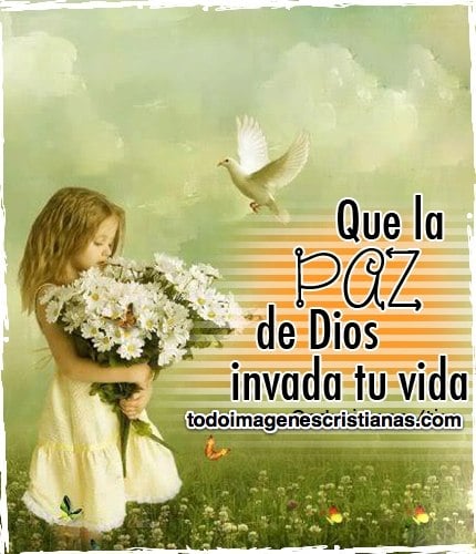 Hoy les queremos dejar un nuevo diseño de imágenes cristianas para desearle paz a la persona que quieran. En la imagen se ve a una niña con un ramo de flores y arriba una paloma blanca que transmite mucha paz. Además de eso también tiene una frase que dice: "Que la paz de DIOS invada tu vida".