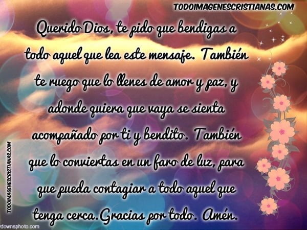 Querido Dios, te pido que bendigas a todo aquel que lea este mensaje. También te ruego que lo llenes de amor y paz, y adonde quiera que vaya se sienta acompañado por ti y bendito. También que lo conviertas en un faro de luz, para que pueda contagiar a todo aquel que tenga cerca. Gracias por todo. Amén.