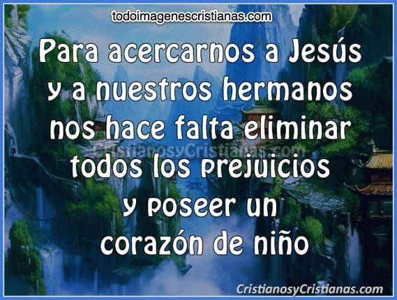 Hoy les queremos dejar esta nueva imagen cristiana de reflexión, la cual los va a hacer pensar y entender que para acercarse a Jesús hay que hacer ciertos cambios en nuestras vidas para ser mejores personas. Puntualmente la imagen habla de que para acercarnos a Jesús y a nuestros hermanos nos hace falta eliminar todos los prejuicios y tener un corazón de niño. Pero qué quiere decir esto... tener un corazón de niño sería no tener maldad, no pensar mal de los demás, hacer siempre el bien, y muchas otras cosas que normalmente las personas adultas ya no tenemos, lamentablemente.